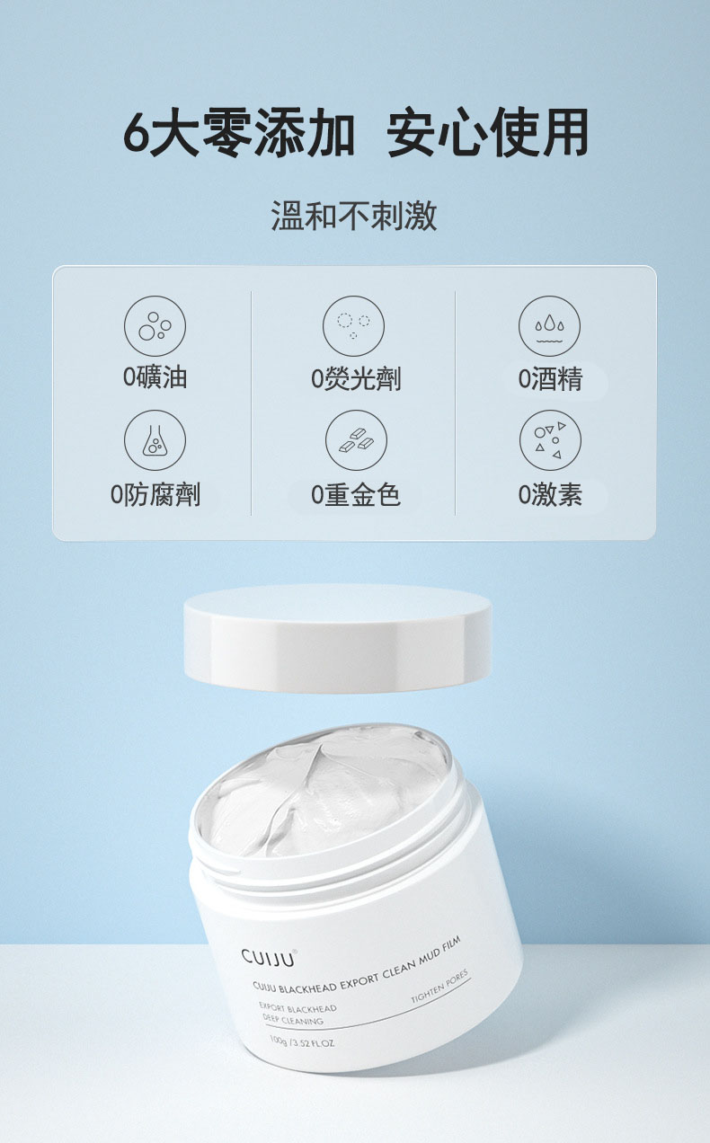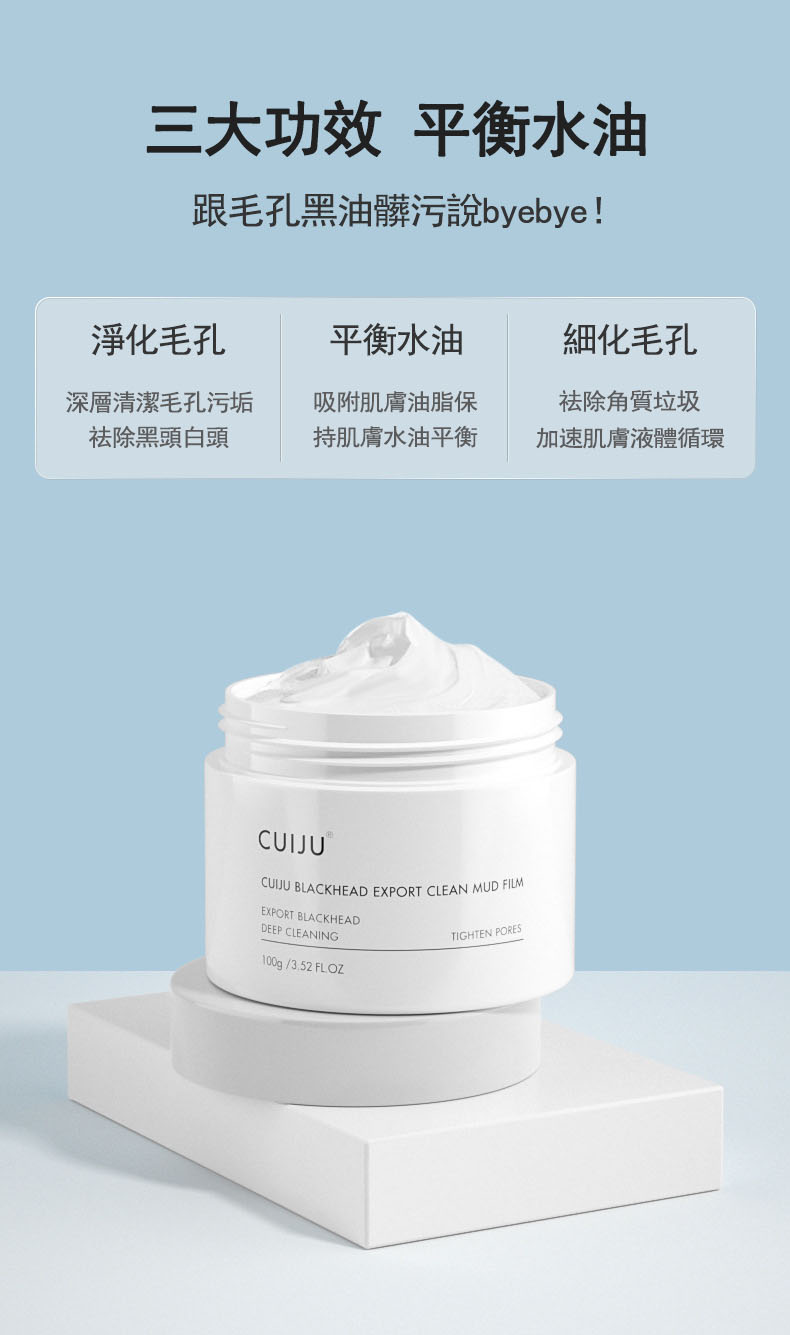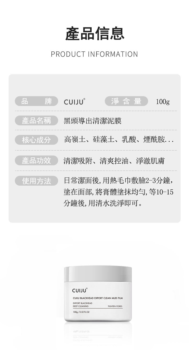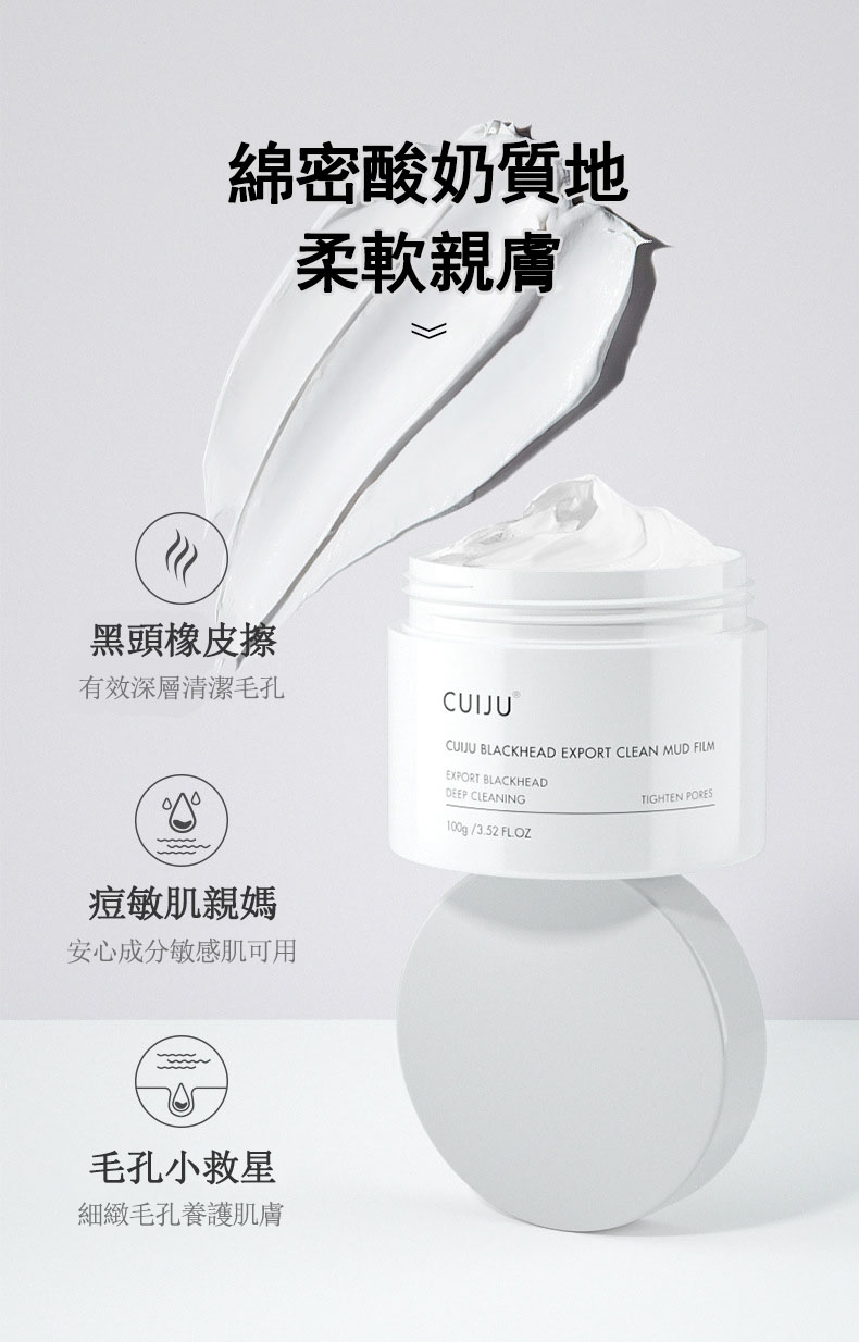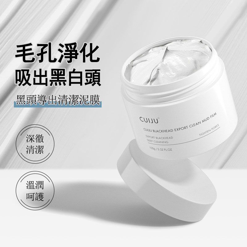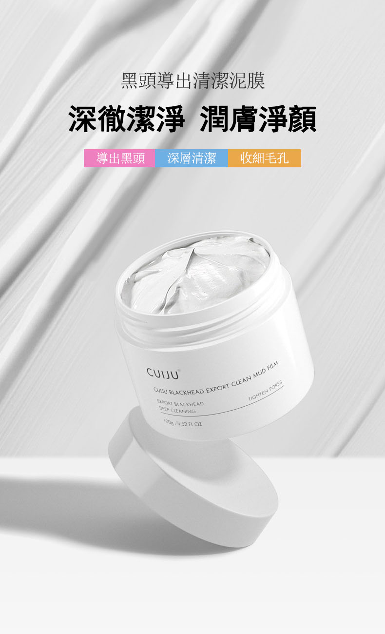 CUIJU火山泥深層毛孔緊緻去黑頭霜、火山泥黑頭清潔泥膜具有吸附毛孔油脂、深層清潔毛孔、讓鼻子更有光澤感與緊緻、黑頭霜透過體溫使油軟化,清潔鼻翼及臉部黑頭,透過按摩將粉刺導出。